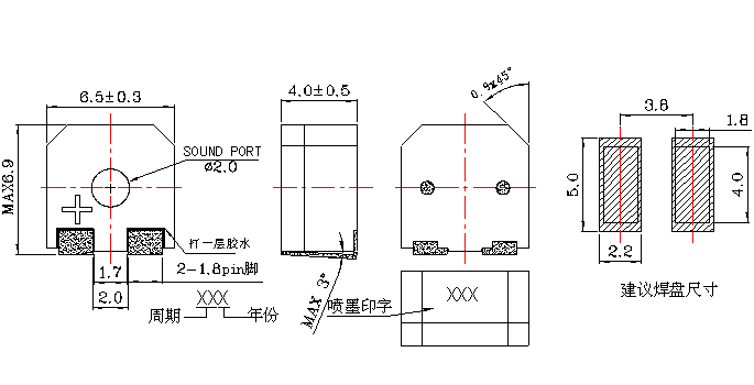 9 | Dimension | mm | 6.5 x 6.5 x H4.0 | See appearance drawing |