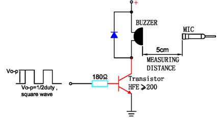 The oscillation frequency, current consumption and sound pressure are measured by the measuring instruments shown below