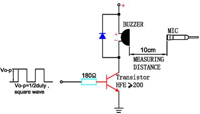 The oscillation frequency, current consumption and sound pressure are measured by the measuring instruments shown below