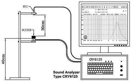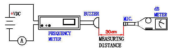The oscillation frequency, current consumption and sound pressure are measured by the measuring instruments shown below