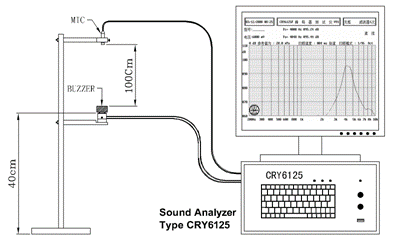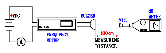 The oscillation frequency, current consumption and sound pressure are measured by the measuring instruments shown below